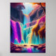 Eine Wasserfallkunst verwandelt sich in eine psychedelische und farbenfrohe Szene.