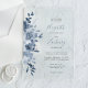 Der links Rand dieser romantischen Hochzeitseinladung ist mit einem Blumenstrauß in Aquarelltönen mit staubblauen Blumen und Pflanzen geschmückt. Der anpassbare Text kombiniert Handschrift, Copperplate und kursiv Schriftart in staubblau und kohlegrau auf einem klaren Hintergrund.