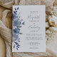 Der links Rand dieser romantischen Hochzeitseinladung ist mit einem Blumenstrauß in Aquarelltönen mit staubblauen Blumen und Pflanzen geschmückt. Der anpassbare Text kombiniert Handschrift, Copperplate und kursiv Schriftart in staubblau und kohlegrau auf weißem Hintergrund. Die Rückseite ist ein koordinierend solides staubiges Blau.