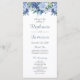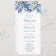 Ein wunderschönes Hochzeitsprogramm mit einer blumengeschmückten Decke von Aquarellfarben in Blautönen. Die Namen der Braut und des Bräutigams sowie die Untertitel erscheinen in eleganter, staubblauer Dekorationsskripte.