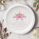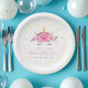 Wasserfarbe Einhorn Gesicht Blumenstrauß Baby Duschpapierplatte. Niedliche Einhornmädchen Dusche Party Teller mit einem süßen Aquarell Einhorngesicht, Blume und goldenen Sternen.