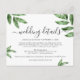 Elegante Hochzeitsausstattungskarte mit klassisch weißem Hintergrund, schwarzer Kalligraphie und kursiver Schriftart, wunderschönes handgemaltes, grünes Blattwerk in Aquarell und Ihre Hochzeitsinformationen.