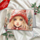 Adorable kleine Winter Weihnachten Fee in ihrem rot gestrickten Winterhut - die schneebedeckten Wälder und Bäume im Hintergrund.