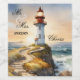 Ein romantisches Weinlabel mit einem Aquarellbild eines Leuchtturms bei Sonnenuntergang. Schön für eine Hochzeit an der Küste oder im Wassersport, und anpassbar für jeden anderen Anlass.