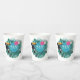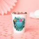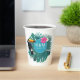 Farbiges Papier-Becher-Design mit einem runden aquamarinen Rahmen umgeben von einem kühnen Touch zwischen Aquarellblüten und Palm-Blätter Hibiskus. Dieses tropische Design eignet sich perfekt für Hochzeiten im Sommer, am Strand und in den Tropen oder ist leicht für Geburtstage und andere Veranstaltungen geeignet. Suchen Sie die ID577, um passende Produkte anzuzeigen.