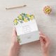 Frische Zitrusfrüchte-Hochzeitseinladungen mit lebhaften Aquarelllemonen und glänzenden grünen Blätter mit hübschen Blüten, ergänzt durch sanfte Lavendelakzente.