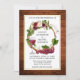 Moderne elegante Watercolor Trauben und Weine Holzreath Wedding Einladung umfasst burgundische Rose, rosa Rosen, rote Rosen und botanische Vegetation. Rustikales Land Holz Hintergrund und Gold Rahmen. Foto zurück