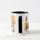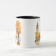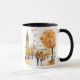Kaffee-Tasse mit einer Aquarell-Abbildung eines Ehepaares, das an einem Herbst/Herbst-Tag in einer Stadtlandschaft spaziert, und einem Baum mit Blätter im Vordergrund. Zusätzliche Größen und Felgen- und Grifffarben sind verfügbar.