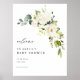 Herzlich willkommen zu Ihrer Veranstaltung mit diesem individuell gestaltbaren Babydusche-Begrüßungsschild. Es ist mit einem Blumenstrauß aus weißen Rosen und Hydrangeas mit grünen Akzenten ausgestattet. Personalisieren Sie diese, indem Sie Ihre Veranstaltungsdetails hinzufügen. Dieses Blumenschild ist perfekt für den Frühling und den Winter Babyduschen. Matching-Elemente sind verfügbar.