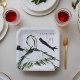 Ein handgemaltes Aquarellmodemodell mit einem Weihnachtsbaumkleid und schwarzen Handschuhen auf stilvollen Urlaubspapieren-Tellern