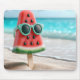Eine Wassermelone mit Sonnenbrille im Sand des Strandes mit landschaftlicher Meereskulisse