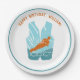 Genießen Sie das personalisierte Party mit einem Wasserski-Thema. Diese Teller zeigen einen Orangen Wasserläufer mit aquamarinem und hellblauem Wasser hinter seinem Set in Form einer Schwimmweste. Ihre personalisierte Nachricht erscheint oben in orangefarbenen Buchstaben.