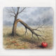 In a foggy landscape, a bare tree stands with a fallen branch on the ground, while a single red apple nearby adds a pop of color
