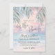 Simple Seaside Watercolor Summer On The Beach Wedding Invitation. The background blends a soft pink, purple, blue, and tan sunset sky that gently transitions into the ocean and sandy shoreline, with the beach set at a slight angle for a modern coastal feel. The artwork stays calm and slightly abstract as waves meet the sand, while palm leaves rest at the top above the horizon for a subtle tropical touch.