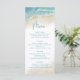 This elegant summer coastal destination wedding reception menu card features a hand painted watercolor beach scene in the corner with ocean waves lapping on the sea shore.
