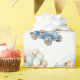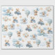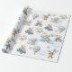 A charming and whimsical gift wrap featuring a repeating pattern of adorable watercolor teddy bears in various poses: flying vintage airplanes, riding in blue cars, holding balloons, sitting on clouds, and floating in hot air balloons. The soft blue, beige, and white color palette is perfect for baby showers, first birthdays, or any special occasion for a little boy or girl. This versatile paper adds a sweet, personalized touch to any present for a little adventurer.