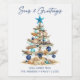 Modern Minimalist Elegance Calligraphy Ink Pen Handwritten Script Seas & Greetings Coastal Holiday Wine Label includes a Watercolor Christmas Tree make of beach ocean driftwood, seashells, sand dollars, nautical anchor ornament and topped with a starfish. Navy Blue Text.