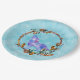 Papier-Teller mit einer grafischen Abbildung, bestehend aus einem lila Wölf, in einer klassischen heulenden Pose. Umgeben von einem illustrierten Kranz aus Holz, Kristallen, Federn und Perlen. Cooles amerikanisches Motiv im boho-Stil.