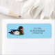 Eine Holzente im Wasser mit weißer Seelose neben der Ente in blauer Umgebung