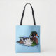 Eine Holzente im Wasser mit weißer Seelose neben der Ente vor blauem Hintergrund