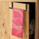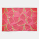 Küchenhandtuch mit Wassermelonen in Scheiben, die auf rosa Untergrund angeordnet sind.