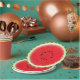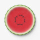 Diese Platte ist eine saftige Wassermelone mit Rinde, Samen und Samenlöchern. Am Rand ist ein Streifen gestreifter Haut sichtbar.