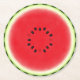 Dieser Untersetzer ist eine saftige Wassermelone-Scheibe mit Rinde, Samen und Samenlöchern. Am Rand ist ein Streifen gestreifter Haut sichtbar.