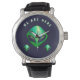 Cool fun watch with a printed image of 3/three green alien heads on a very dark blue background, with a caption/phrase which reads "WE ARE HERE"
