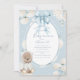 Sweet little bear in a white coat and blue satin bow flowing over the event details. White hydrangeas and a blue and white shabby chic polkadot background, We’ve used lovely fonts and scripts done in coordinating colors baby shower invite. Hydrangeas.