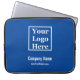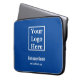 Sie können die Laptop-Ärmel Ihres Unternehmens markieren, indem Sie Ihr Logo hinzufügen. Sie können auch den Namen und die Webadresse des Unternehmens hinzufügen. Der Laptop-Ärmel ist tief blau. Der Text ist weiß.