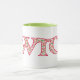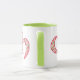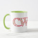 Eine Spaß Wecker-Tasse mit einer grünen Lippe und einem Griff und das Waliser-Wort "cwtch", "Umarmung" oder "Umarmung", in einem keltischen Skript bedeutend, füllten mit einem hübschen Rot-, Grünen und weißenblumenmuster.
