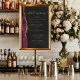 An elegant sign for your wedding bar menu. The words "bar menu" appears in gold-colored handwriting calligraphy with swashes at the beginning and end, with customizable text below. A burgundy red watercolor agate design trimmed with gold faux glitter decorates the left border on a slate black background. See our collection for matching wedding invitation suite and day-of stationery.