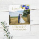 Ihre Gäste werden diese natürliche Schönheit der Aquarellen Liebe finden. Von der Carolina Blue Collection hat dieses romanische Sommerlayout eine Fotovorlage vorne in der Mitte. Liebe und Dank Text umgibt Foto, und verheiratete Namen und Vorlagen Datum vorne unter Foto. Ein Blumenstrauß ganz oben rechts in den Farbtönen Blau, Gelb und lila, mit grünen und goldenen Blätter.