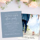 Erschwingliche staubblaue Ankündigung Datum freihalten für einen Empfang oder ein Party zum Feiern Ihres Auftritts oder Ihrer privaten Hochzeit. Die Vorderseite zeigt "Save the Date für unser glückliches aller Party" in einer Mischung aus schlichter weißer Typografie und einem eleganten weißen Drehbuch mit Swashes, Ihrer individuellen Hochzeitsankündigung, Party oder Empfang Save the Date Details und Ihren Namen in einem signaturähnlichen Skript. Auf der Rückseite finden Sie Ihr Lieblings-Foto, Vornamen, Hochzeitsdaten und Empfang.