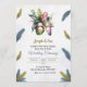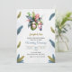 Wedding invitation featuring tropical flowers and colorful feather accents on a textured background. Details in elegant script and bold type.