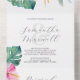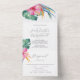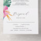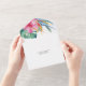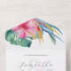 Make a bold statement with these wedding invitations with RSVP cards, designed for a destination wedding filled with tropical charm. Featuring watercolor tropical flowers and lush palm leaves in vibrant shades of pink, orange, and green, these bold wedding invitations capture the essence of paradise.