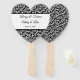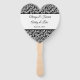 Dieser Hochzeitspaddle-Fan wird mit einem eleganten schwarz-weißen Damast-Druck und Beispielnamen und Datum gezeigt. Passen Sie dieses Element an, und ändern Sie Namen und Datum nach Bedarf.