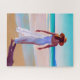 Puzzle in einer Illustration einer Frau in einem fließenden weißen Kleid und breit gebrannten Hut Spaziergänge entlang eines ruhigen Strandes mit pulsierendem blauen Wasser. Die abgelegenen Berge und der klare Himmel schaffen eine ruhige und malerische Szene.