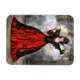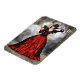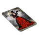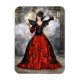 3D digitale Darstellung eines schönen weiblichen Zauberers in einem roten und schwarzen Kleid mit Flügeln auf einem fantasievollen Schlosshintergrund