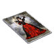 3D digitale Darstellung eines schönen weiblichen Zauberers in einem roten und schwarzen Kleid mit Flügeln auf einem fantasievollen Schlosshintergrund