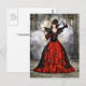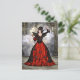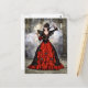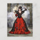 3D digitale Darstellung eines schönen weiblichen Zauberers in einem roten und schwarzen Kleid mit Flügeln auf einem fantasievollen Schlosshintergrund
