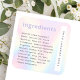 Ingrediente Produktkennzeichnung in modernem minimalistischem Stil mit dem Namen Ihres Unternehmens, der in einer weißen Box auf einem weichen pastellfarbenen Regenbogen-Hintergrund gedreht wurde.