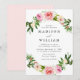 Elegante, blumengeschmückte Einladungen mit einem Spray aus Aquarellpinke und Blume mit lebhaften grünen Blätter am oberen und unteren Ende der Einladung. Personalisieren Sie die Hochzeit lädt durch Hinzufügen Ihrer Namen, Datum und Uhrzeit, Veranstaltungsname, etc. Die Einladung kehrt zu einem rot-rosa Hintergrund zurück.