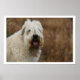 Fotografie eines weich beschichteten Wheaten Terrier stehend im Herbstgras.