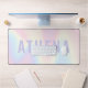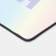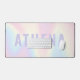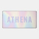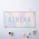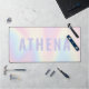 Trendy, personalisierte Schreibtischmatte mit weichem, pastellfarbenem Regenbogen-Hintergrund und dem lila Namen.