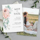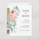 Erfahren Sie mehr über Ihre Hochzeitspläne mit dieser wunderbar eleganten Aquarellkarte Save the Date. Die Einrichtung besteht aus sanften pastellfarbenen Rose, Pfefferkuchen und Eukalyptus-Blätter in Pastellrosa, Pfirsich und Beige, die mit einer üppigen Vegetation versehen sind. Ein hübsches Face-Pairing vermittelt Ihre Details stilvoll. Diese trendige Farbkombination ist eine beliebte Wahl mit moderner Anziehungskraft. Auf der Rückseite dieser Karte befindet sich eine Bildvorlage, um das ausgewählte vertikale Foto einzubinden. Ersetzen Sie das in der Entwurfsvorlage angezeigte Foto. Personalisieren Sie die benutzerfreundliche Textvorlage mit Ihren Daten.