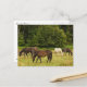 Auf dieser Postkarte finden sich braune und weiße Pferde, die an einem warmen Sommertag im hohen Gras eines goldenen Feldes weiden.