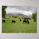 Eine Herde schwarzer Rinder grasen das hellgrüne Gras auf dieser schönen Ranch vor Elko, Nevada. Nevadas Ruby Mountain liegt im Hintergrund und der Himmel ist voller Wolken. Dieses digitale Gemälde verleiht dem Original einen künstlerischen Look.