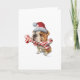 Bulldog Weihnachtskarte Weihnachtskarte mit einem glücklichen Lächelhund mit einem Bonbonbonbonbonbon, keiner in seinem lobenden Mund sitzend mit einem Santaclaushut für Winterfeiern und lustige Hundefreude des neuen Jahres.