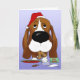 Basset Hound versucht, mit dem Essen aller Kekse des Weihnachtsmanns davonzukommen. Basset Hound trägt eine Weihnachtsmannmütze, mit Ingwer Brot Mann in seinem Mund und innen der Karte liest: "Ho... Ho... Wie?